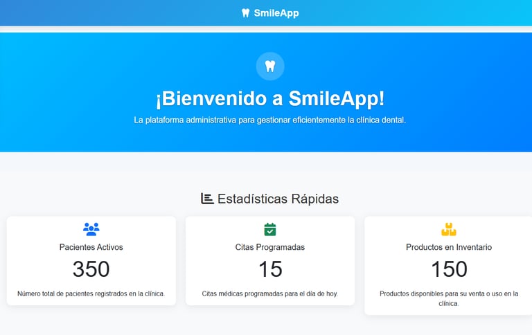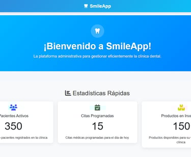 SmileApp es una plataforma diseñada para gestionar de forma eficiente todas las áreas administrativas de una clínica dental. Centraliza la información, optimiza procesos y facilita el control de pacientes, citas, inventario y finanzas, brindando una experiencia más organizada y productiva para todo el equipo.